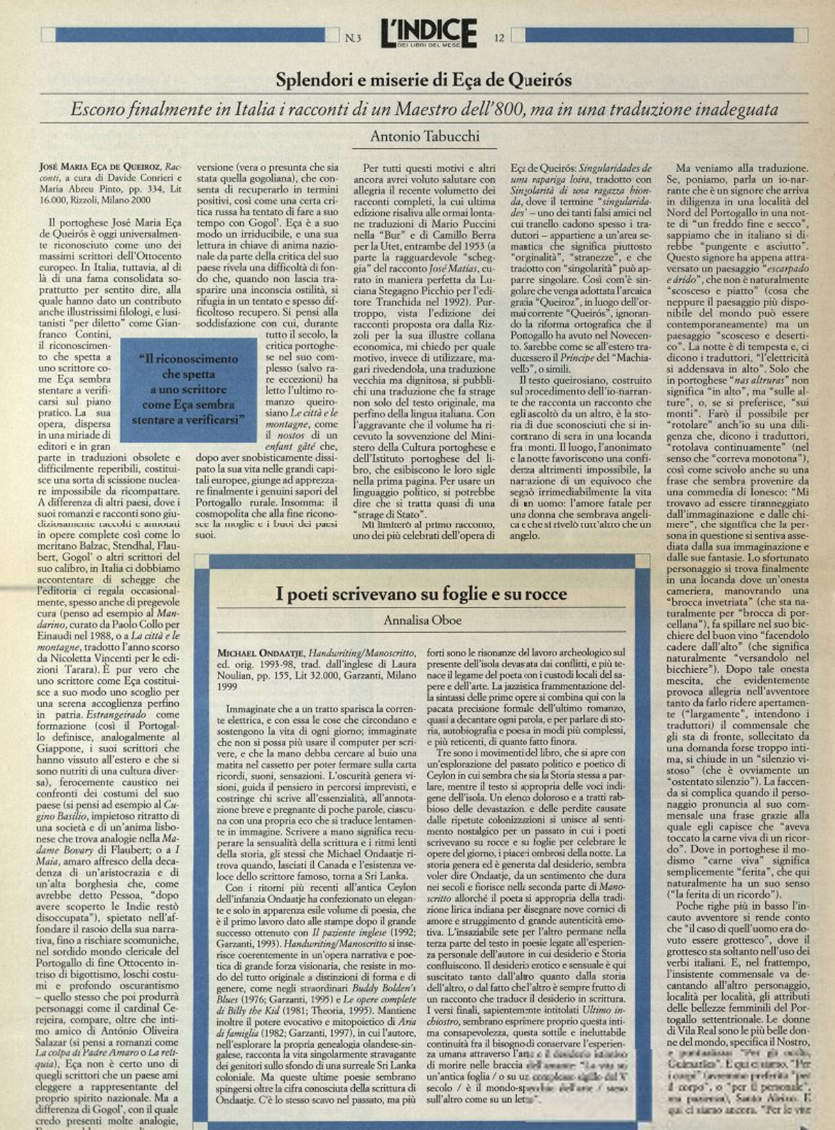 Eça è a suo modo un irriducibile, e una sua lettura in chiave di anima nazionale da parte della critica del suo paese rivela una difficoltà di fondo che, quando non lascia trasparire una inconscia ostilità, si rifugia in un tentato e spesso difficoltoso recupero. Si pensi alla soddisfazione con cui, durante tutto il secolo, la critica portoghese nel suo complesso (salvo rare eccezioni) ha letto l’ultimo romanzo queirosiano Le città e le montagne, come il nostos di un enfant gàté che, dopo aver snobisticamente dissipato la sua vita nelle grandi capitali europee, giunge ad apprezzare finalmente i genuini sapori del Portogallo rurale. Insomma: il cosmopolita che alla fine riconosce la moglie e i buoi dei paesi suoi. Per tutti questi motivi e altri ancora avrei voluto salutare con allegria il recente volumetto dei racconti completi, la cui ultima edizione risaliva alle ormai lontane traduzioni di Mario Puccini nella “Bur” e di Camillo Berrà per la Utet, entrambe del 1953 (a parte la ragguardevole “scheggia” del racconto José Matias, curato in maniera perfetta da Luciana Stegagno Picchio per l’editore Tranchida nel 1992).